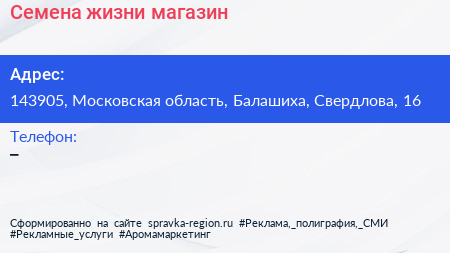 Семена жизни, магазин по адресу 143905, Московская область, Балашиха, Свердлова, 16 в дальнейшем Организация, размещена в следующих категориях: