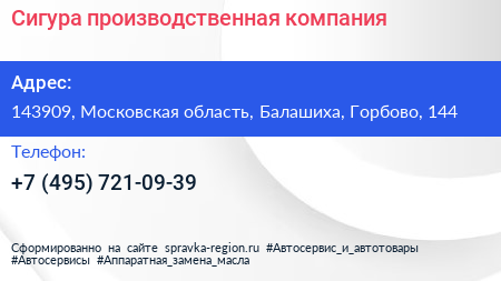 Сигура, производственная компания по адресу 143909, Московская область, Балашиха, Горбово, 144 в дальнейшем Организация, размещена в следующих категориях:
