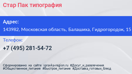 Стар-Пак, типография по адресу 143982, Московская область, Балашиха, Гидрогородок, 15 в дальнейшем Организация, размещена в следующих категориях: