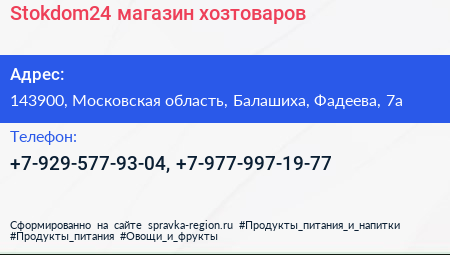 Stokdom24, магазин хозтоваров по адресу 143900, Московская область, Балашиха, Фадеева, 7а в дальнейшем Организация, размещена в следующих категориях: