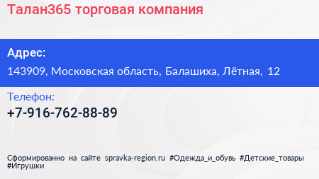 Талан365, торговая компания по адресу 143909, Московская область, Балашиха, Лётная, 12 в дальнейшем Организация, размещена в следующих категориях: