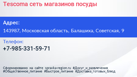Tescoma, сеть магазинов посуды по адресу 143987, Московская область, Балашиха, Советская, 9 в дальнейшем Организация, размещена в следующих категориях: