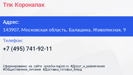 Тпк Коронапак по адресу 143907, Московская область, Балашиха, Живописная, 9 в дальнейшем Организация, размещена в следующих категориях: