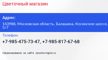 Цветочный магазин по адресу 143988, Московская область, Балашиха, Косинское шоссе, 5/7 в дальнейшем Организация, размещена в следующих категориях: