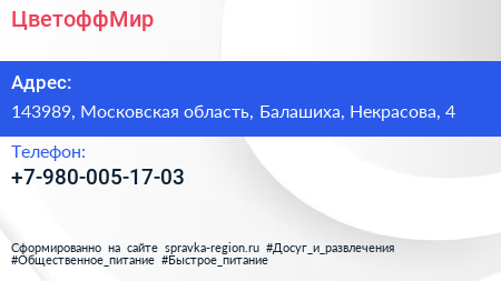 ЦветоффМир по адресу 143989, Московская область, Балашиха, Некрасова, 4 в дальнейшем Организация, размещена в следующих категориях: