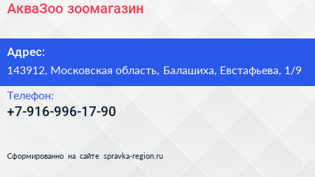 АкваЗоо, зоомагазин по адресу 143912, Московская область, Балашиха, Евстафьева, 1/9 в дальнейшем Организация, размещена в следующих категориях: