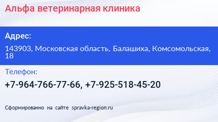 Альфа, ветеринарная клиника по адресу 143903, Московская область, Балашиха, Комсомольская, 18 в дальнейшем Организация, размещена в следующих категориях:
