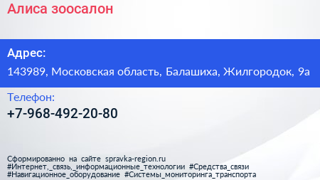 Алиса, зоосалон по адресу 143989, Московская область, Балашиха, Жилгородок, 9а в дальнейшем Организация, размещена в следующих категориях: