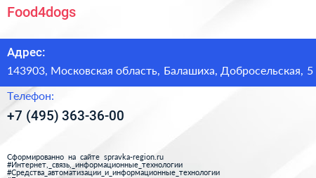 Food4dogs по адресу 143903, Московская область, Балашиха, Добросельская, 5 в дальнейшем Организация, размещена в следующих категориях: