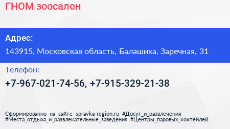 ГНОМ, зоосалон по адресу 143915, Московская область, Балашиха, Заречная, 31 в дальнейшем Организация, размещена в следующих категориях: