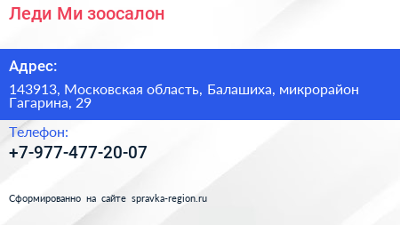 Леди Ми, зоосалон по адресу 143913, Московская область, Балашиха, микрорайон Гагарина, 29 в дальнейшем Организация, размещена в следующих категориях: