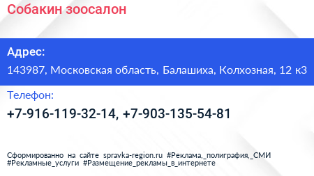 Собакин, зоосалон по адресу 143987, Московская область, Балашиха, Колхозная, 12 к3 в дальнейшем Организация, размещена в следующих категориях: