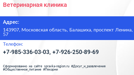 Ветеринарная клиника по адресу 143907, Московская область, Балашиха, проспект Ленина, 57 в дальнейшем Организация, размещена в следующих категориях: