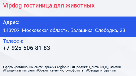 Vipdog, гостиница для животных по адресу 143909, Московская область, Балашиха, Слободка, 28 в дальнейшем Организация, размещена в следующих категориях: