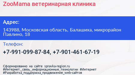 ZooMama, ветеринарная клиника по адресу 143988, Московская область, Балашиха, микрорайон Павлино, 18 в дальнейшем Организация, размещена в следующих категориях: