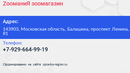 ZooманиЯ, зоомагазин по адресу 143903, Московская область, Балашиха, проспект Ленина, 81 в дальнейшем Организация, размещена в следующих категориях: