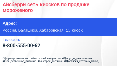 Айсберри, сеть киосков по продаже мороженого по адресу Отстойно-разворотная площадка конечной станции «Уссурийская», вл21 с1, Алтайская улица, район Гольяново, Москва, Центральный федеральный округ, 107589, Россия в дальнейшем Организация, размещена в следующих категориях: