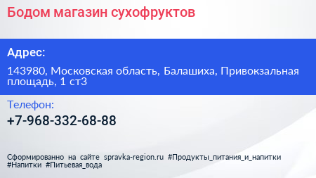 Бодом, магазин сухофруктов по адресу 143980, Московская область, Балашиха, Привокзальная площадь, 1 ст3 в дальнейшем Организация, размещена в следующих категориях: