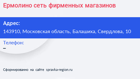 Ермолино, сеть фирменных магазинов по адресу 143910, Московская область, Балашиха, Свердлова, 10 в дальнейшем Организация, размещена в следующих категориях: