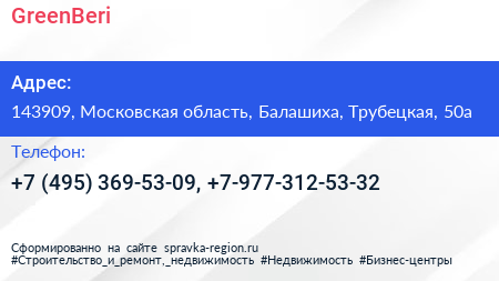 GreenBeri по адресу 143909, Московская область, Балашиха, Трубецкая, 50а в дальнейшем Организация, размещена в следующих категориях:
