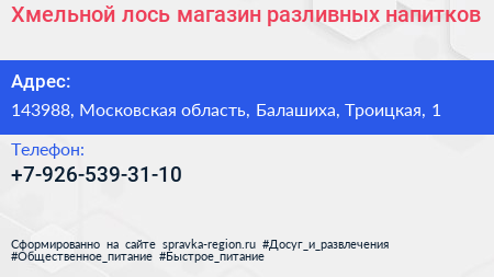 Хмельной лось, магазин разливных напитков по адресу 143988, Московская область, Балашиха, Троицкая, 1 в дальнейшем Организация, размещена в следующих категориях: