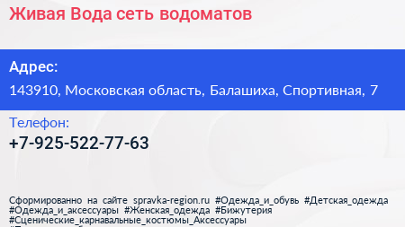 Живая Вода, сеть водоматов по адресу 143910, Московская область, Балашиха, Спортивная, 7 в дальнейшем Организация, размещена в следующих категориях: