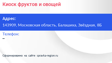 Киоск фруктов и овощей по адресу 143909, Московская область, Балашиха, Звёздная, 8Б в дальнейшем Организация, размещена в следующих категориях: