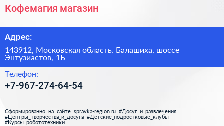 Кофемагия, магазин по адресу 143912, Московская область, Балашиха, шоссе Энтузиастов, 1Б в дальнейшем Организация, размещена в следующих категориях: