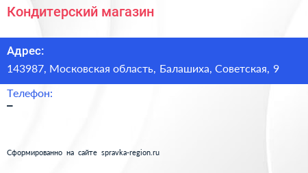 Кондитерский магазин по адресу 143987, Московская область, Балашиха, Советская, 9 в дальнейшем Организация, размещена в следующих категориях: