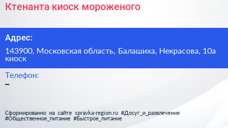 Ктенанта, киоск мороженого по адресу 143900, Московская область, Балашиха, Некрасова, 10а киоск в дальнейшем Организация, размещена в следующих категориях: