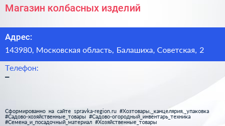 Магазин колбасных изделий по адресу 143980, Московская область, Балашиха, Советская, 2 в дальнейшем Организация, размещена в следующих категориях: