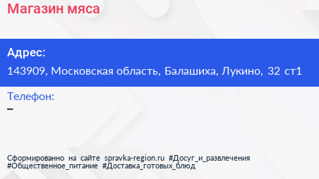Магазин мяса по адресу 143909, Московская область, Балашиха, Лукино, 32 ст1 в дальнейшем Организация, размещена в следующих категориях: