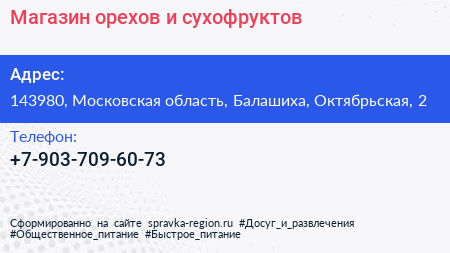 Магазин орехов и сухофруктов по адресу 143980, Московская область, Балашиха, Октябрьская, 2 в дальнейшем Организация, размещена в следующих категориях: