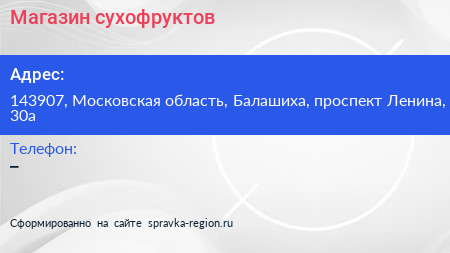 Магазин сухофруктов по адресу 143907, Московская область, Балашиха, проспект Ленина, 30а в дальнейшем Организация, размещена в следующих категориях: