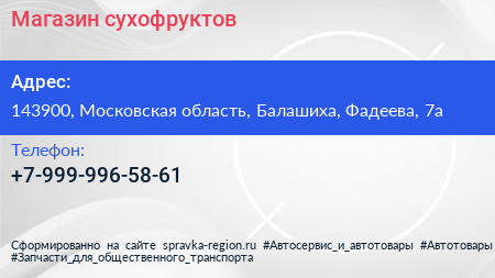 Магазин сухофруктов по адресу 143900, Московская область, Балашиха, Фадеева, 7а в дальнейшем Организация, размещена в следующих категориях: