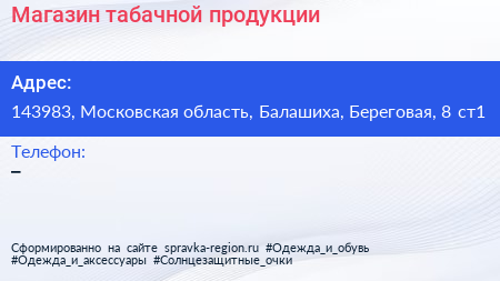 Магазин табачной продукции по адресу 143983, Московская область, Балашиха, Береговая, 8 ст1 в дальнейшем Организация, размещена в следующих категориях: