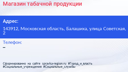 Магазин табачной продукции по адресу 143912, Московская область, Балашиха, улица Советская, 2 в дальнейшем Организация, размещена в следующих категориях:
