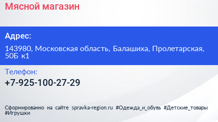Мясной магазин по адресу 143980, Московская область, Балашиха, Пролетарская, 50Б к1 в дальнейшем Организация, размещена в следующих категориях: