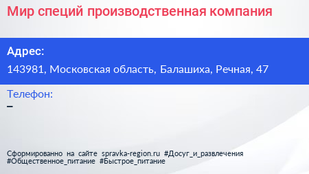 Мир специй, производственная компания по адресу 143981, Московская область, Балашиха, Речная, 47 в дальнейшем Организация, размещена в следующих категориях: