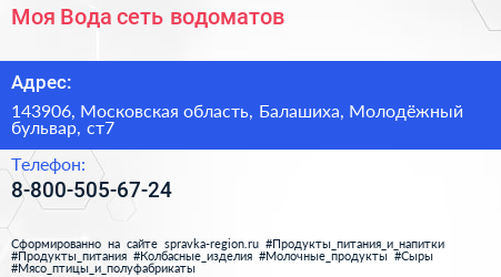 Моя Вода, сеть водоматов по адресу 143906, Московская область, Балашиха, Молодёжный бульвар, ст7 в дальнейшем Организация, размещена в следующих категориях: