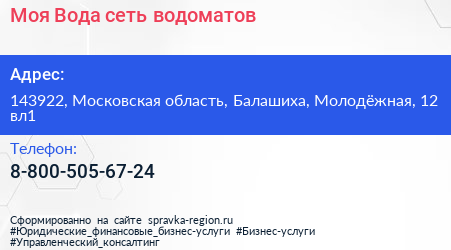 Моя Вода, сеть водоматов по адресу 143922, Московская область, Балашиха, Молодёжная, 12 вл1 в дальнейшем Организация, размещена в следующих категориях: