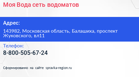 Моя Вода, сеть водоматов по адресу 143982, Московская область, Балашиха, проспект Жуковского, вл11 в дальнейшем Организация, размещена в следующих категориях: