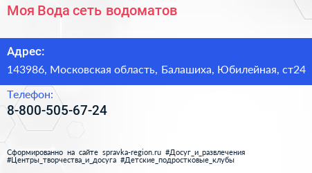 Моя Вода, сеть водоматов по адресу 143986, Московская область, Балашиха, Юбилейная, ст24 в дальнейшем Организация, размещена в следующих категориях: