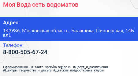 Моя Вода, сеть водоматов по адресу 143986, Московская область, Балашиха, Пионерская, 14Б вл1 в дальнейшем Организация, размещена в следующих категориях: