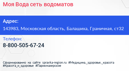 Моя Вода, сеть водоматов по адресу 143983, Московская область, Балашиха, Граничная, ст32 в дальнейшем Организация, размещена в следующих категориях: