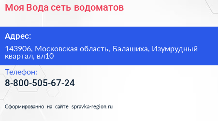 Моя Вода, сеть водоматов по адресу 143906, Московская область, Балашиха, Изумрудный квартал, вл10 в дальнейшем Организация, размещена в следующих категориях:
