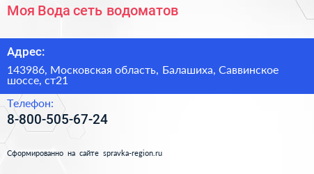 Моя Вода, сеть водоматов по адресу 143986, Московская область, Балашиха, Саввинское шоссе, ст21 в дальнейшем Организация, размещена в следующих категориях: