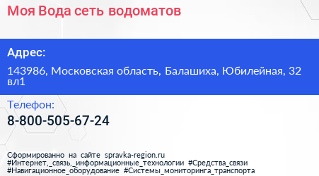 Моя Вода, сеть водоматов по адресу 143986, Московская область, Балашиха, Юбилейная, 32 вл1 в дальнейшем Организация, размещена в следующих категориях: