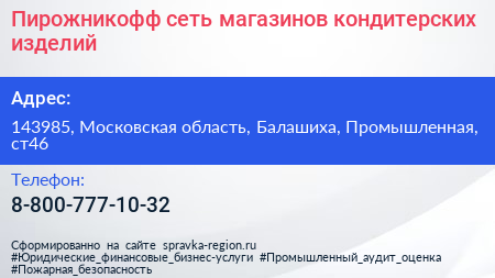 Пирожникофф, сеть магазинов кондитерских изделий по адресу 143985, Московская область, Балашиха, Промышленная, ст46 в дальнейшем Организация, размещена в следующих категориях: