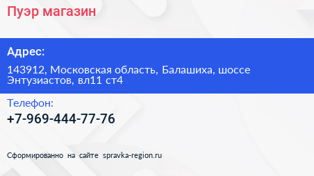 Пуэр, магазин по адресу 143912, Московская область, Балашиха, шоссе Энтузиастов, вл11 ст4 в дальнейшем Организация, размещена в следующих категориях: